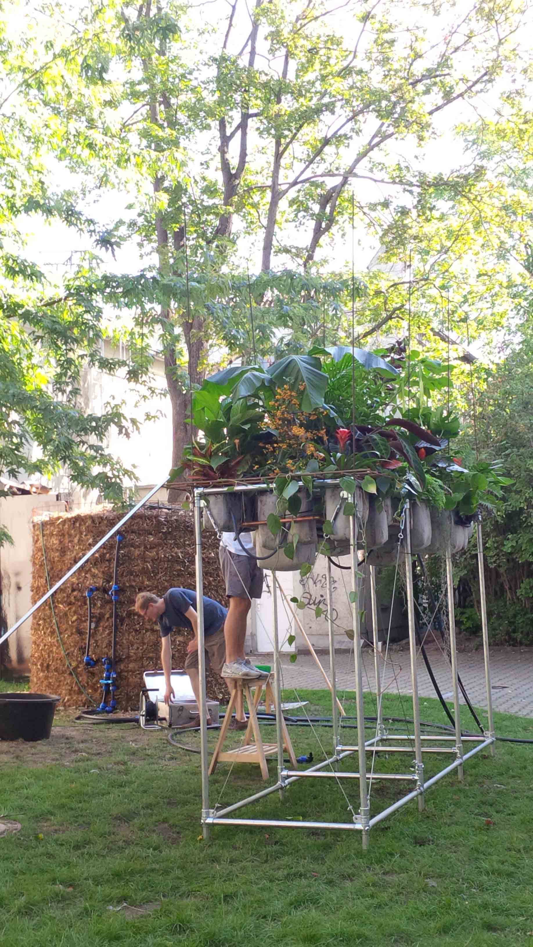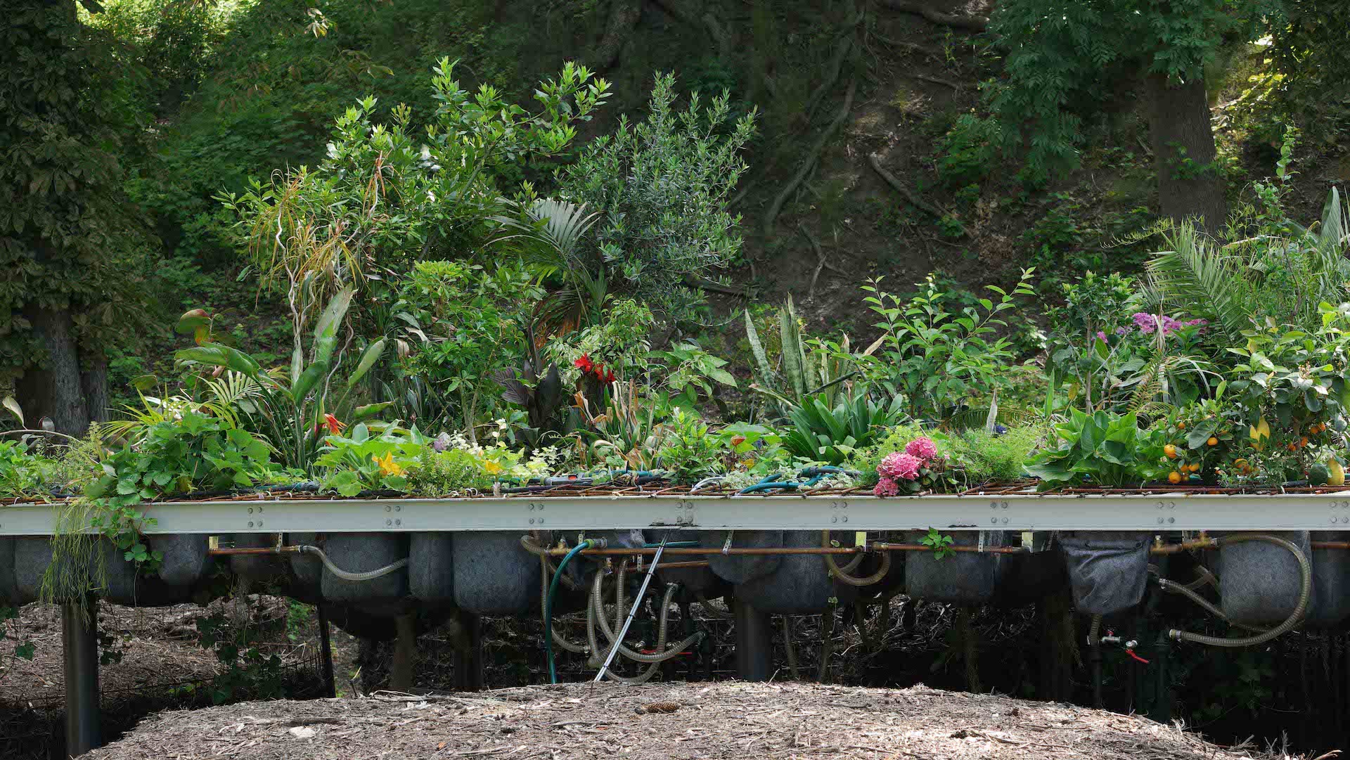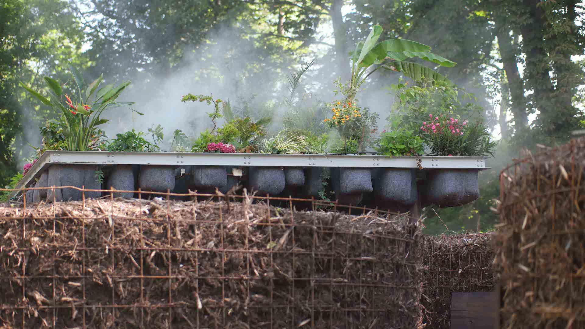 Aus dem Erläuterungsbericht: »Die Luft ist warm und es riecht nach feuchter, frischer Erde. Es ist seltsam windgeschützt zwischen den neun großen, dunklen, schwerfälligen Kompostkörpern. Die Formen sind unterschiedlich, manche groß und schlank, andere breit und flach. Der Tag zwischen den Erdformen ist halb Licht und halb Schatten. (...) Schwarze faustdicke Kabel laufen aus den Zylindern über den Boden zu einem scheinbar gemeinsamen Ziel. (...) Die Kabelenden laufen auf drei Meter Höhe in einen paradiesischen Garten. Das Beet steht schräg im Hang, die Wiese darunter ist begehbar. Die bepflanzte Fläche ist nur wenige Meter entfernt und ebenerdig zum höher gelegenen Weg. Tropische, bunte Pflanzen und Palmen wuchern nach oben, Luftwurzeln und Rankpflanzen wachsen zwischen den Stützen unter dem Beet und ergeben eine mit der Zeit dichter werdende Pflanzenhöhle. Plötzlich ein anschwellendes Rauschen, aus dem Beet steigt eine Dampfwolke empor, die den Garten in Nebel hüllt und langsam in kleinen Tropfen zu Boden rieselt oder einfach weggeweht wird. (...)